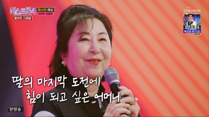 (MHN 박선하 기자) ‘미스트롯4’에서 펼쳐졌던 모녀의 감동 무대가 다시 한 번 안방극장을 울렸다. 24일 방송된 ‘미스트롯4 올하트 스페셜’에서는 가수 허찬미와 그의 어머니 김