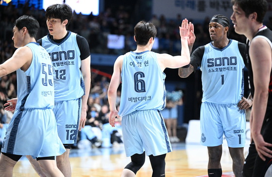 고양 소노 이정현과 네이던 나이트가 21일 고양소노아레나에서 열린 현대모비스와 홈 경기에서 하이파이브를 하고 있다. KBL 제공프로농구 고양 소…