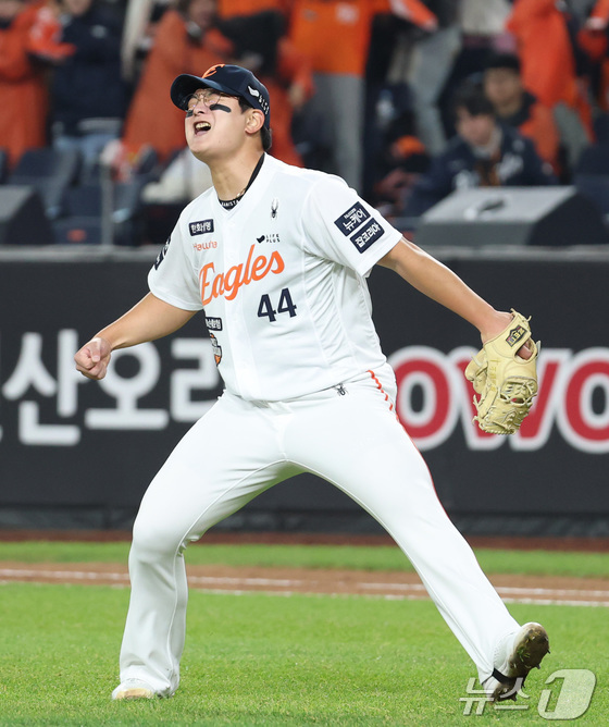 일 대전 한화생명볼파크 열린 프로야구 신한 SOL뱅크 KBO 한국시리즈 차전 LG 트윈스와 한화 이글스의 경기에서 한화 김서현이 마무리 투구를 마치며 환호…