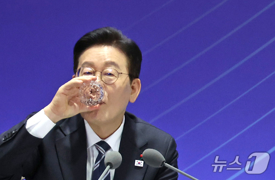 이재명 대통령이 23일 울산전시컨벤션센터에서 열린 '울산의 마음을 듣다‘ 타운홀 미팅에서 물을 마시고 있다. 2026.1.23/뉴스1 News1 허경 기자…