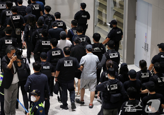 캄보디아 당국의 범죄단지 단속으로 적발돼 구금됐던 한국인들이 일 오전 인천국제공항 터미널을 통해 송환되고 있다. 공동취재../뉴스…