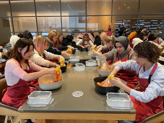 풀무원 뮤지엄김치간의 김치 체험 프로그램에 참여한 외국인 관람객들이 김치를 직접 만들어보고 있다.풀무원 제공풀무원017810 …