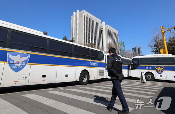 12·3 비상계엄과 관련한 윤석열 전 대통령의 내란 우두머리 혐의 사건 1심 선고를 하루 앞둔 18일 서울 서초구 서울중앙지방법원 앞 삼거리에 경찰 차벽이 설치돼 있다.…
