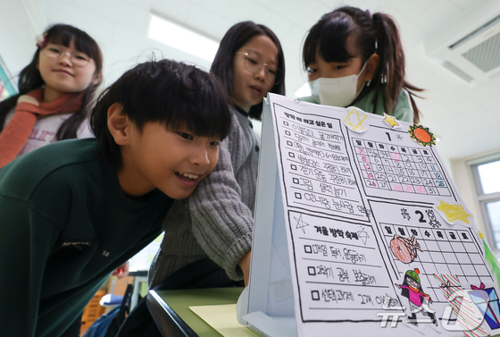 서울 구로구 개봉초등학교에서 열린 겨울방학식에서 3학년 학생들이 서로의 방학 계획표를 보며 이야기를 나누고 있다. 2024.12.27/뉴스1 News1 김도…