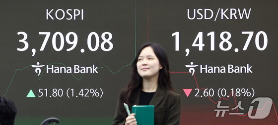 일 오전 서울 중구 하나은행 딜링룸 전광판에 개장 시황이 나오고 있다. 이날 코스피는 전 거래일.보다 .포인트.%…