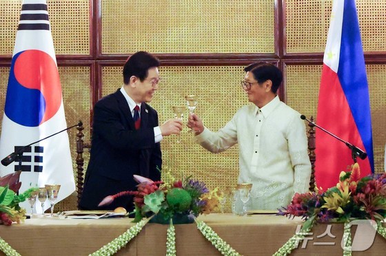 이재명 대통령과 페르디난드 마르코스 주니어 필리핀 대통령이 3일현지시간 필리핀 마닐라 말라카냥궁에서 열린 국빈만찬에서 건배를 하고 있다. 2026.3.…