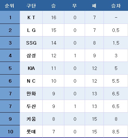 [OSEN=수원, 이후광 기자] 시즌 전망에서 우승후보가 아니었던 팀이 우승후보로 꼽힌 LG 트윈스, 삼성 라이온즈를 따돌리고 단독 1위를 질주 중이다. 프로야구 KT 위즈는 23