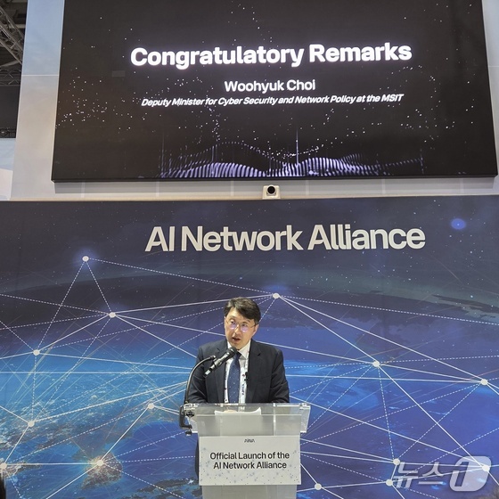 최우혁 정보보호네트워크정책실장이 AI네트워크 얼라이언스 출범식에서 축사를 하고 있다. 과학기술정보통신부 제공과학기술정보통신부는 MWC26 현장에…