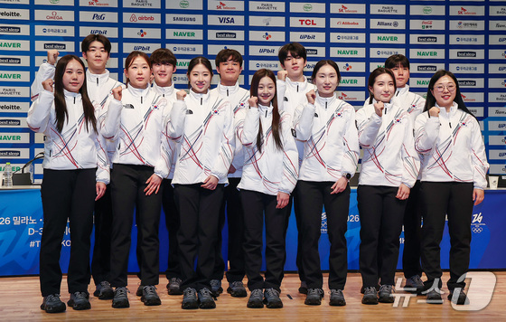 지난 7일 충북 진천선수촌 챔피언하우스에서 열린 2026 밀라노코르티나동계올림픽대회 D-30 미디어데이에서 대표 선수들이 기념촬영을 하는 모습. 2026.1.7/뉴스1 …