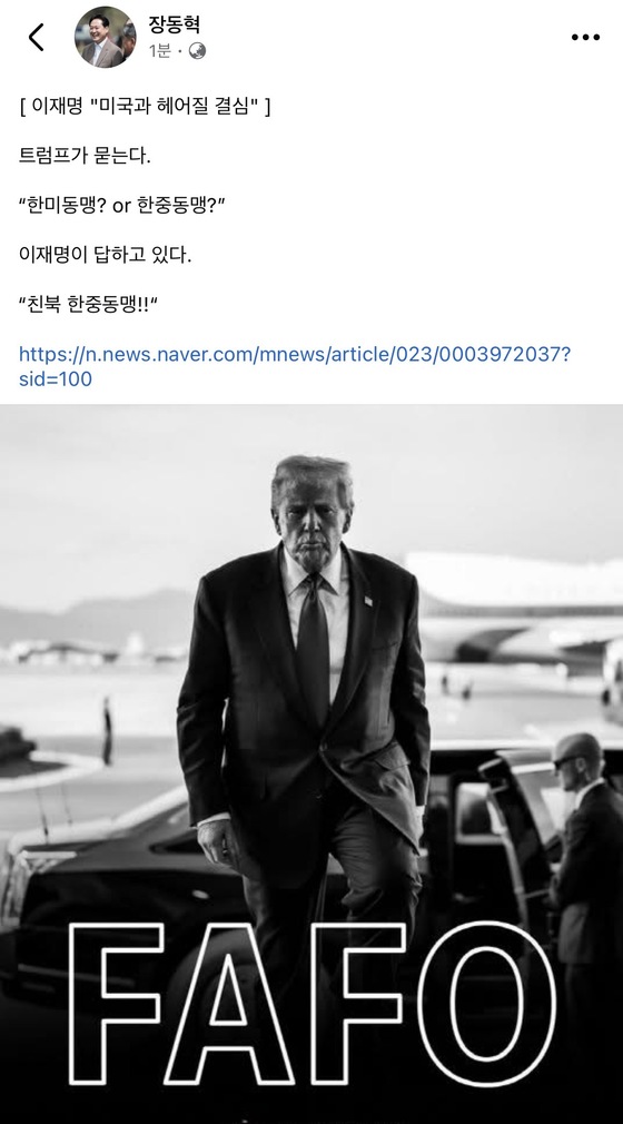 장동혁 국민의힘 대표 페이스북 갈무리장동혁 국민의힘 대표가 21일 이재명 대통령의 정동영 통일부 장관 옹호 발언에 대해 "친북 한중동맹"을 택한 것이라고 비판했다…