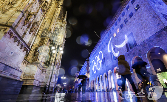2026 밀라노·코르티나담페초 동계올림픽 개막을이틀 앞둔 4일현지시간 이탈리아 밀라노 두오모 성당 옆 건물에 오륜기 이미지가 송출되고 있다. 2026.…