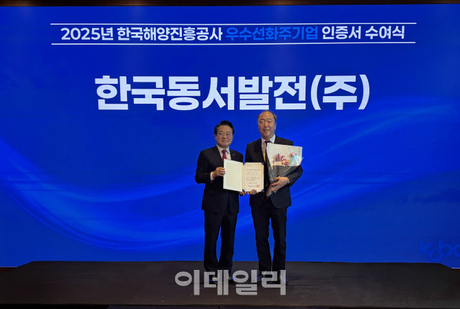 [이데일리 정두리 기자] 한국동서발전은 10일 부산 파크하얏트 호텔에서 열린 ‘우수 선화주기업 인증’ 수여식에서 선화주 간 상생협력과 해운물류 안정화에 기여한 공로를 인정받아 최고