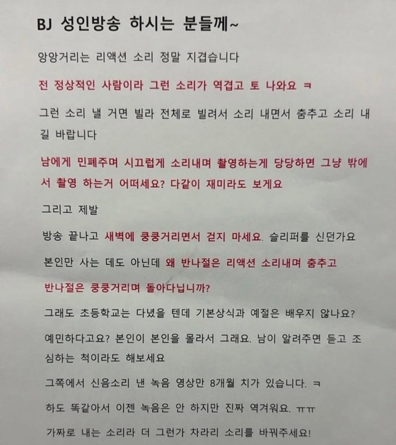 "성인방송 BJ 리액션 소리 역겹다"…빌라 입주민이 호소문, 어디지?
