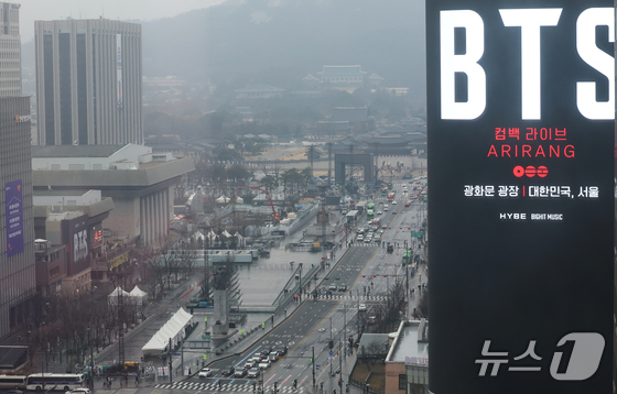 방탄소년단BTS 완전체 컴백 공연을 사흘 앞둔 18일 서울 광화문광장 인근 빌딩 전광판에 컴백 공연을 알리는 광고가 표출되고 있다. 2026.3.18 …