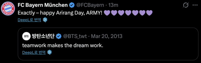 김민재의 바이에른 뮌헨도 '보라색' 하트 연발.. BTS 컴백에 "해피 아리랑 데이, 아미(ARMY)!" 환호
