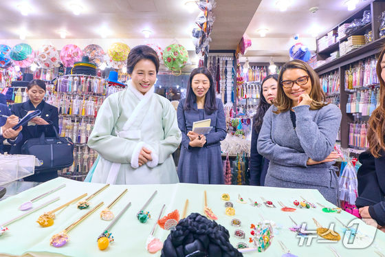 김혜경 여사와 루이스 이나시우 룰라 다시우바 브라질 대통령 부인 호잔젤라 다시우바 여사가 21일 서울 종로구 광장시장 내 한복가게를 찾아 비녀, 뒤꽃이 등을 살펴보고 있…