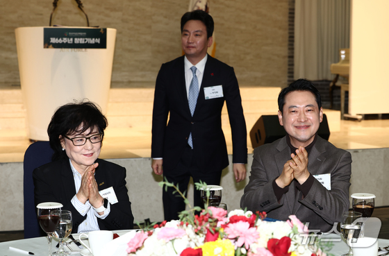 장동혁 국민의힘 대표가 18일 오전 서울 용산구 공군호텔에서 열린 한국여성단체협의회 제66주년 창립기념식에서 손뼉을 치고 있다. 왼쪽부터 허명 협회장, 박장범 KBS 사…