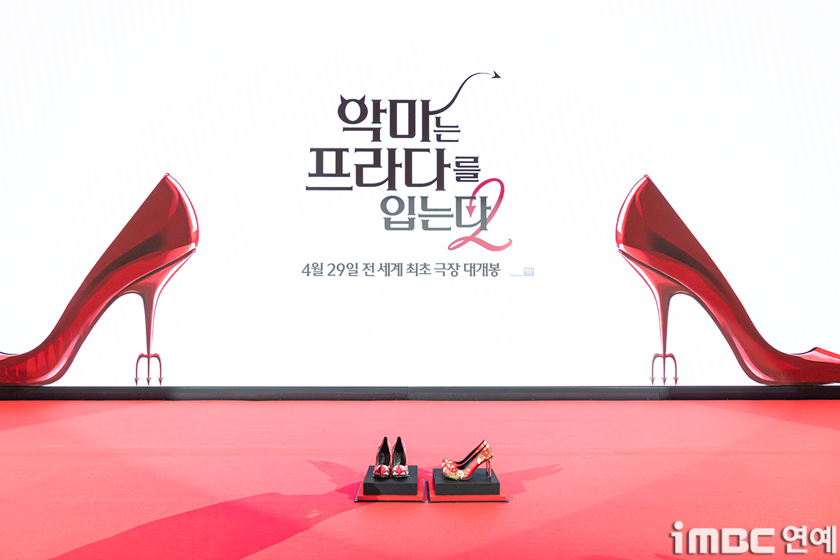 8일 오전 서울 종로구 포시즌스 호텔에서 열린 영화 ‘악마는 프라다를 입는다 2’ 내한 기자간담회에 메릴 스트립, 앤 해서웨이에게 전달 될 방한 기념 구두 선물이 눈길을 끌고 있다