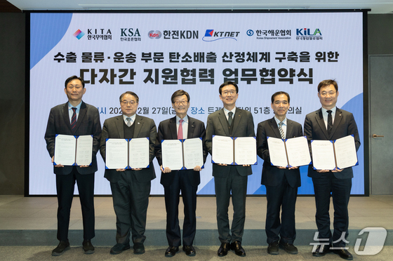 27일 서울 강남구 삼성동 트레이드타워에서 개최된 '수출 물류·운송 부문 탄소배출 산정체계 마련을 위한 다자간 업무협약MOU' 체결식에서 협약기관 주요…
