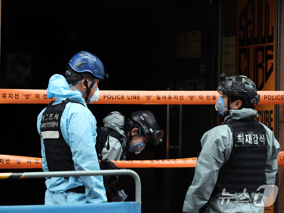 15일 오전 서울 중구 소공동의 한 캡슐호텔에서 전날 화재사고가 발생, 경찰과 소방당국 등 관계자들이 합동감식을 진행하고 있다. 이 사고로 외국인 8명을 포함해 총 10…
