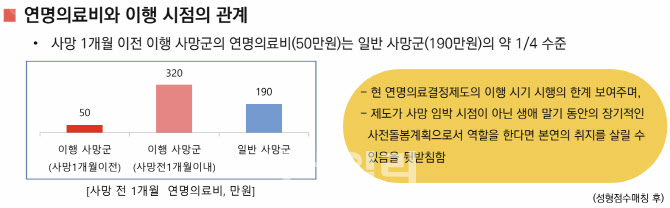 [이데일리 안치영 기자] 임종 과정에 있는 환자의 연명의료 중단을 늦게 결정하면 연명의료비가 오히려 많이 든다는 연구 결과가 나왔다. 환자 본인이 일찍 결정해 임종 시점까지 만족도