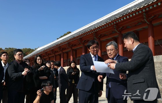 최휘영 문화체육관광부 장관이 7일 서울 종로구 세계유산 종묘를 찾아, 최근 서울시의 세운상가 재개개발계획에 따른 영향을 살펴보고 대책을 점검하고 있다 문화체육관…