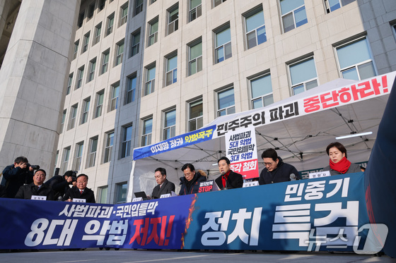 장동혁 국민의힘 대표가 15일 서울 여의도 국회 본관 앞에 마련된 천막 농성장에서 열린 최고위원회의에서 발언하고 있다. 2025.12.15/뉴스1 News1…