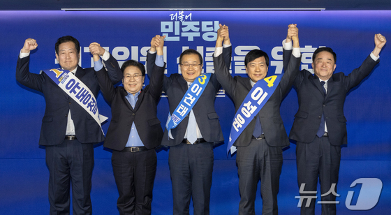 지난 23일 서울 여의도 더불어민주당 중앙당사에서 열린 최고위원 선출을 위한 1차 합동연설회에서 유동철왼쭉부터, 문정복, 이건태, 이성윤, 강득구 최고…