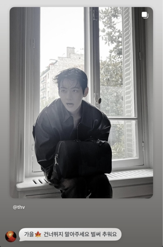[OSEN=박근희 기자] 그룹 방탄소년단 멤버 뷔가 사라진 가을에 대한 아쉬움을 표했다. 23일 뷔는 ‘가을 건너뛰지 말아주세요 벌써 추워요’라는 글과 함께 사진을 게재했다. 공개