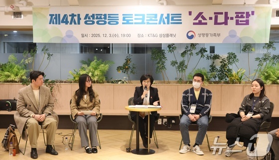 원민경 성평등가족부 장관이 서울 성동구 KTG 상상플래닛에서 열린 제4차 성평등 토크콘서트 '소다팝'에서 청년 참가자들과 함께 '사회 참여기 청년의 성별 인식격…