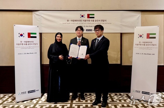 한-아랍에미리트 자율주행 수출승인서 전달식 현장. 오른쪽부터 유민상 오토노머스에이투지 CSO, 하정우 청와대 AI미래기획수석, 뮤니라 알 마르주키 스페이스42 상무. &…