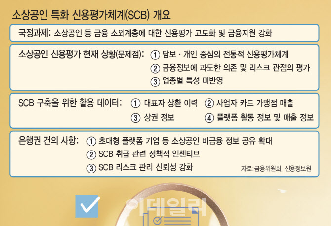 [이데일리 김일환 기자] [이데일리 김나경 기자] ‘소상공인 특화 신용평가체계’(SCB)를 구축하기로 한 금융당국이 은행별 대출 실적(잔액·건수)을 분기별로 공개할 계획이다. 은행