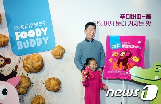 김홍국 하림그룹 회장 1일 오전 서울 강남구 CGV청담씨네시티에서 열린 어린이식 전문 브랜드 '푸디버디' 브랜드 론칭 행사에서 제품을 소개하고 있다. 하림 제공…