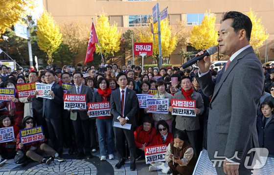 장동혁 국민의힘 대표가 지난 23일 오후 경남 창원 성산구 한서빌딩 앞 광장에서 열린 '민생회복 법치수호 국민대회'에 참석해 발언하고 있다. 2025.11.23/뉴스1…