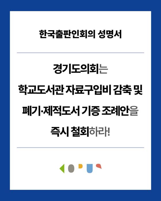 한국출판인회의한국출판인회의가 11일 경기도의회를 향해 학교도서관 자료구입비 감축과 폐기·제적도서 기증을 골자로 한 두 조례의 철회를 촉구했다.출판이회의는 성명에서…