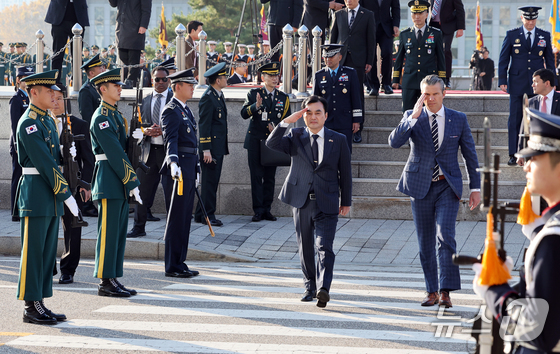 안규백 국방부 장관과 피트 헤그세스 미국 국방부 장관이 지난 일 서울 국방부 연병장에서 열린 의장행사를 마치고 제차 한미안보협의회SCM를 참석하…