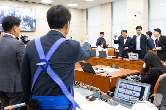 일 서울 여의도 국회에서 열린 기후에너지환경노동위원회 고용노동부 등에 대한 국정감사에서 전국민주노동조합총연맹민노총 증인 채택 여부 관련으로 여야 의…