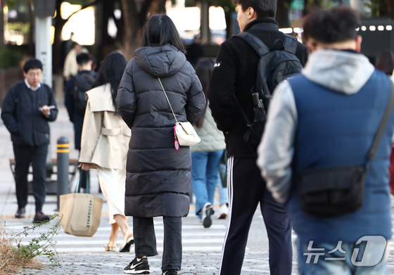 전국 아침 최저 기온이 -~도로 올 가을 가장 추운 날씨를 보인 지난달 일 오전 서울 종로구 광교 사거리에서 시민들이 두꺼운 외투를 입고 발걸음을 옮기고 있다.…