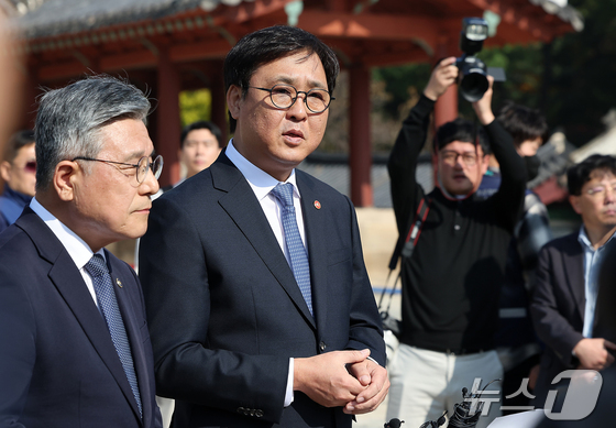 최휘영 문화체육관광부 장관이 7일 오후 서울 종묘 정전 하월대에서 종묘 앞 개발 관련 대법원 판결과 관련해 입장을 밝히고 있다. 왼쪽은 허민 국가유산청장. 2025.11…