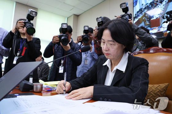 추미애 위원장이 지난 일 서울 여의도 국회에서 열린 법제사법위원회 대전고법 등에 대한 국정감사에서 오창훈 제주지법 부장판사 등에 대한 동행명령장에 서명하고 있다. …