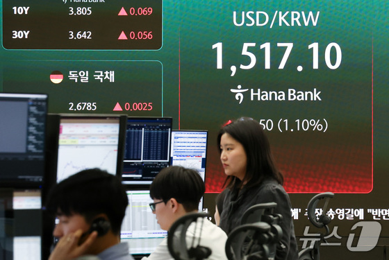 서울 중구 하나은행 딜링룸 전광판에 원·달러 환율이 표시되어 있다. 이날 서울외환시장에서 원·달러 환율은 1517.3원에 주간거래를 마쳤다. 2026.3.23 ©…