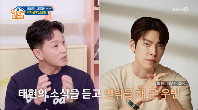 KBS TV '옥탑방의 문제아들' 캡처김우빈의 미담이 전해졌다.일 오후 방송된 KBS TV 예능 프로그램 '옥탑방의 문제아들'에서는 배우 진태현이 출연해 …