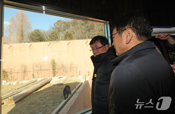 광주 북구 생용동 우치공원 동물원에서 김성환 기후에너지환경부 장관이 강기정 시장에게 판다 수용 여건에 대한 설명을 들으며 곰을 바라보고 있다. 2026.1.22 &cop…