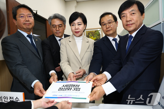 전현희 더불어민주당 사법불신 극복·사법행정 정상화 TF 위원장이 3일 서울 여의도 국회 의안과에 사법행정 정상화 3법을 제출하고 있다. 왼쪽부터 김승원, 김기표 의원, …