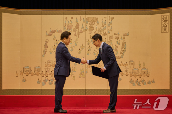 이재명 대통령이 2025년 7월 23일 서울 용산 대통령실 청사에서 열린 임명장 및 위촉장 수여식에서 김경수 지방시대위원장에게 임명장을 수여하고 있다.대통령실…