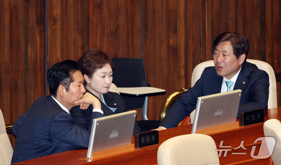 지난 13일 서울 여의도 국회에서 열린 제434국회임시회 제4차 본회의에서 정청래 더불어민주당 대표가 이언주, 황명선 최고위원사진 왼쪽부터&…