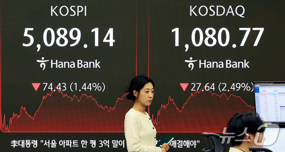 6일 서울 중구 하나은행 본점 딜링룸 전광판에 코스피 종가가 표시돼 있다. 이날 코스피는 전 거래일 대비 74.43포인트1.44% 하락한 5,089.1…