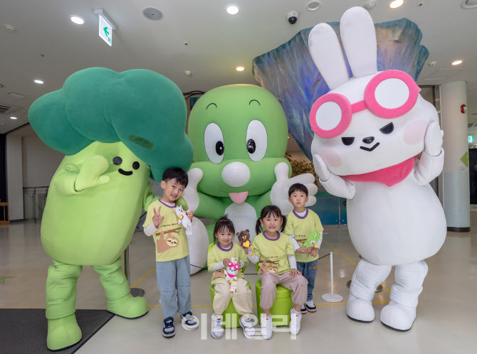 KB금융그룹이 16일 서울 도봉구 둘리뮤지엄에서 진행한 ‘문화의 날, 별과 함께 날다’ 이벤트에 참여한 어린이 관람객들이 기념촬영을 하고 있다. 사진=KB금융그룹 제공 [이데일리