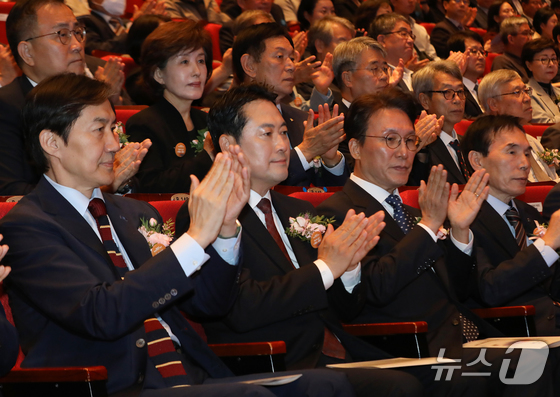 김민석 국무총리, 장동혁 국민의힘 대표, 조국 조국혁신당 비상대책위원장이 일 오전 경남 창원 마산회원구 ·아트센터 대극장에서 열린 제주년 부마민주항쟁기념식에…