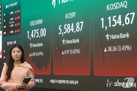 6일 서울 중구 하나은행 본점 딜링룸 전광판에 종가가 표시되고 있다. 이날 코스피 지수는 전일대비 0.97p0.02% 오른 5584.87에 코스닥은 전…